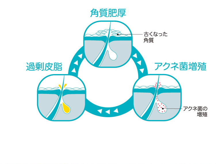 「角質肥厚・過剰皮質・アクネ菌の増殖」